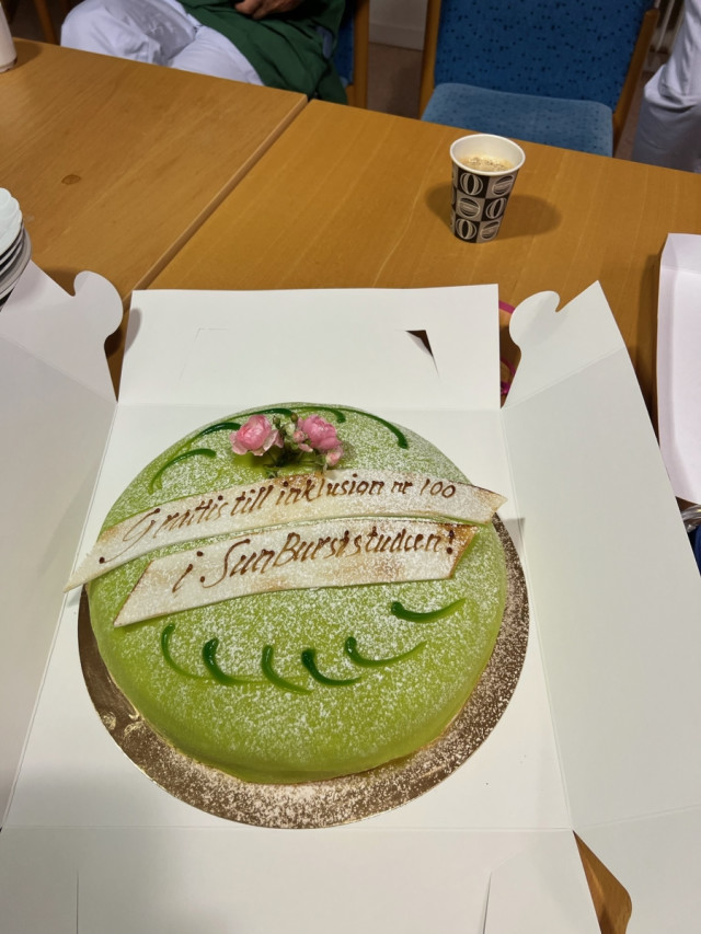 2023-10-24SunBurst-studien har inkluderat sin 100:e patient i Sverige! Inklusionen skedde på Sahlgrenska Universitetssjukhuset och i samband med det belönades dom med en tårta.